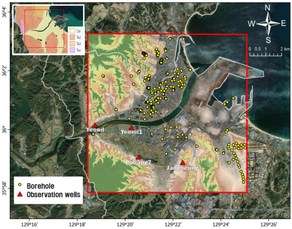 - Ongoing climate change intensifies seasonal groundwater fluctuations, a critical parameter in geotechnical engineering directly influencing effective stress and subsurface structures. Such seasonal variations affect geotechnical analysis accuracy (e.g., liquefaction, slope stability), yet current practice often neglects spatio-temporal variability by assuming static levels or using simple interpolation. To address this issue, this study analyzed quarterly fluctuations in groundwater levels and their relationship with topographical factors, using data from 266 boreholes and four monitoring wells in the Hyeongsan River basin, Pohang, South Korea. Three spatial interpolation techniques were applied using GIS (Geographic Information System) to estimate regional groundwater distributions, and their accuracy was evaluated against monitoring well data. Results showed that Kriging yielded the most stable performance with relatively low prediction errors. The spatial distribution and variability maps generated using this optimal method clearly demonstrated how groundwater fluctuations are influenced by topographical factors and revealed their regional patterns. These findings highlight the importance of incorporating seasonal variability and spatial continuity in groundwater modeling to improve the reliability of geotechnical design and risk assessment.
