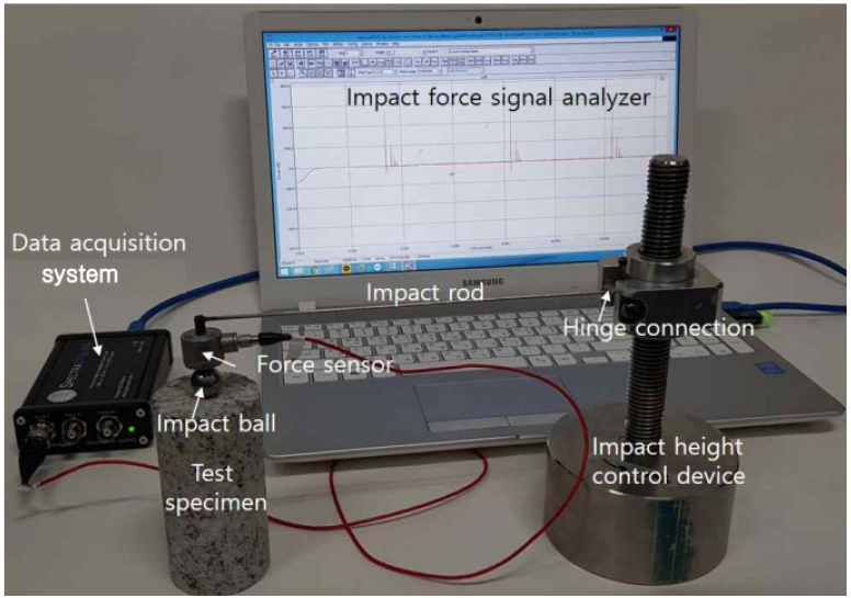 - This study aims to propose a non-destructive method for evaluating the compressive strength of materials such as rock and concrete. Rather than being limited to a single impact, the proposed approach measures the impact force response signals generated by multiple impacts occurring during the rebound process following the initial impact. These signals are converted into a cumulative energy-based indicator, which is then used for strength evaluation. To implement this approach, a dedicated experimental system capable of impact generation and signal measurement was newly designed and assembled. An initial impact was applied to the specimen using a rotational free-fall mechanism, allowing successive rebound-induced impacts to occur continuously. Concrete specimens with different strength levels and sizes were prepared as test samples, and impact force experiments were conducted to record the response signals generated during the impact process. Based on the measured signals from both the initial and rebound impacts, the total impact force signal energy was calculated for each specimen and compared with the corresponding compressive strength obtained from direct compression tests. The results demonstrated a clear correlation between the total impact force signal energy derived from the response signals and the directly measured compressive strength of the concrete specimens. These findings indicate that the compressive strength of materials, including concrete, can be non-destructively evaluated using the total impact force signal energy obtained from impact force response signals.