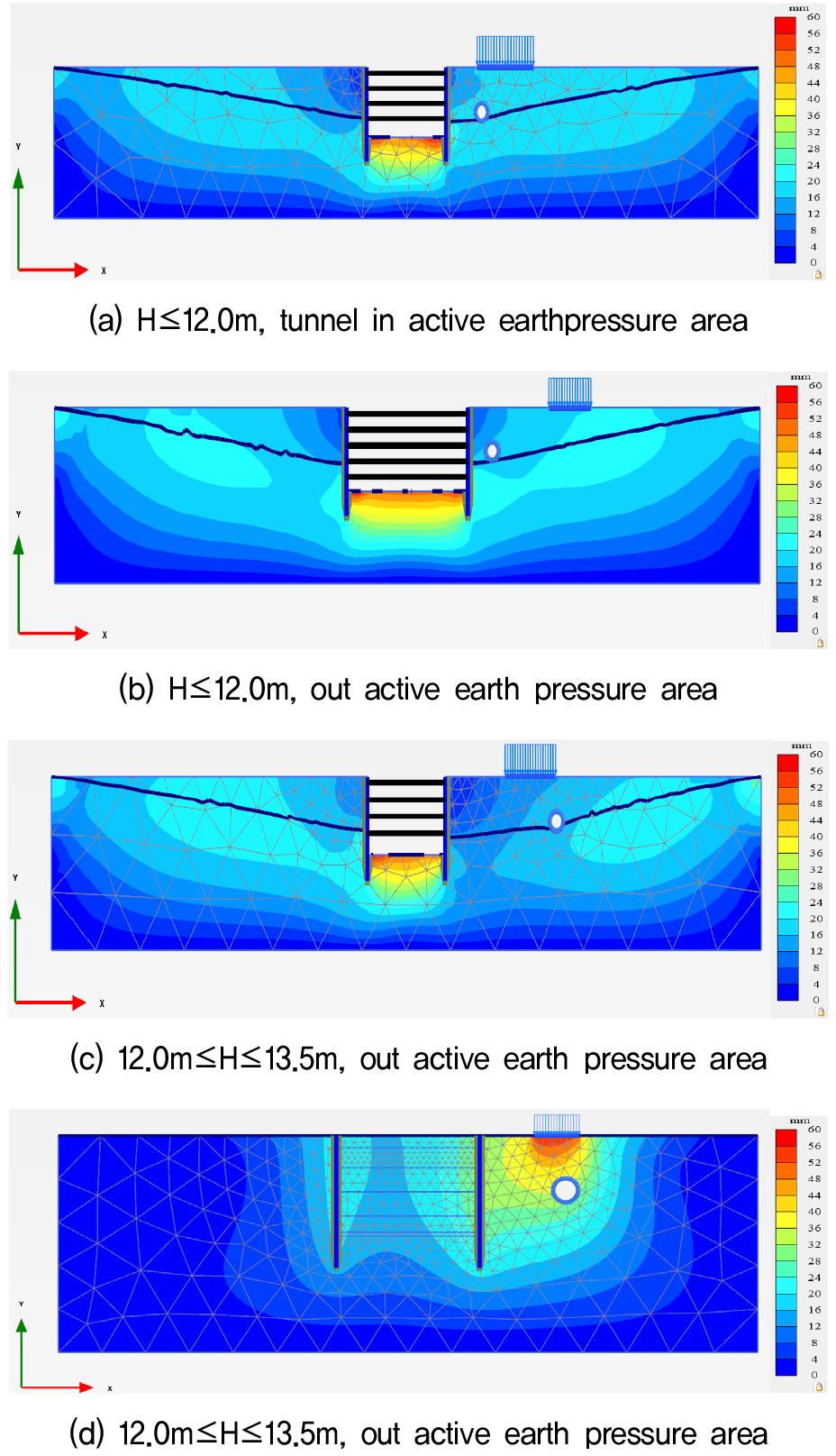 - This study investigates the relationship between wall displacement and the factor of safety of temporary retaining walls through numerical analysis. Numerical analyses were performed considering various conditions, including ground conditions, separation distance from adjacent foundations, foundation size, and applied loads. The analyses assumed a situation in which the retaining wall is installed in adjacent ground where foundations and tunnels have already been constructed. The results indicate that wall displacement is strongly influenced by geometric conditions, while the factor of safety is mainly affected by factors related to the mobilization of resistance and sliding of the retained ground. In addition, when the wall displacement satisfied the design criteria, the factor of safety was also found to meet the required standards. However, when the displacement exceeded the allowable limits, the reliability of the factor of safety was significantly reduced.