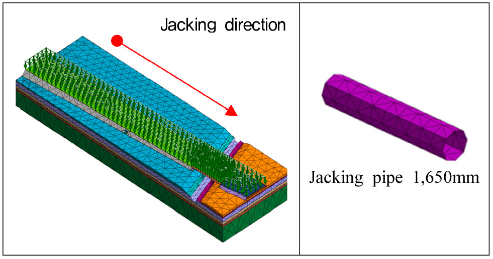 - This study evaluates the structural stability and long-term serviceability of a trenchless jacking pipe installed beneath a main road in the Public Housing District. The assessment is carried out through staged numerical simulations that consider vertical and horizontal displacements during each construction phase. A three-dimensional finite element analysis (FEM) was conducted using MIDAS GTS NX, modeling seven construction stages and one service stage. The ground was represented using a Mohr-Coulomb elastic-plastic model, and the jacking pipe was modeled with shell elements. The target structures included the road deck, bridge foundation, and jacking pipe. Displacement values were quantitatively compared against allowable limits. The simulation showed that vertical displacements were 1.232 mm for the road deck (4.9% of the 25 mm limit), 0.976 mm for the bridge foundation (4.8% of 20 mm), and 2.41 mm for the jacking pipe (8.0% of 30 mm), indicating safe conditions well within 10% of allowable thresholds. Notably, displacements during intermediate construction stages were lower than those observed in the final service stage, suggesting that stepwise loading contributed to stress redistribution. Furthermore, a comparison with field measurements yielded a maximum deviation of ±3%, confirming the reliability of the numerical model. The staged analysis approach provides a more accurate prediction of real structural behavior compared to service-stage-only simulations. For trenchless construction in urban environments, integrating stage-wise numerical analysis with field monitoring data is essential to ensuring structural safety and performance.