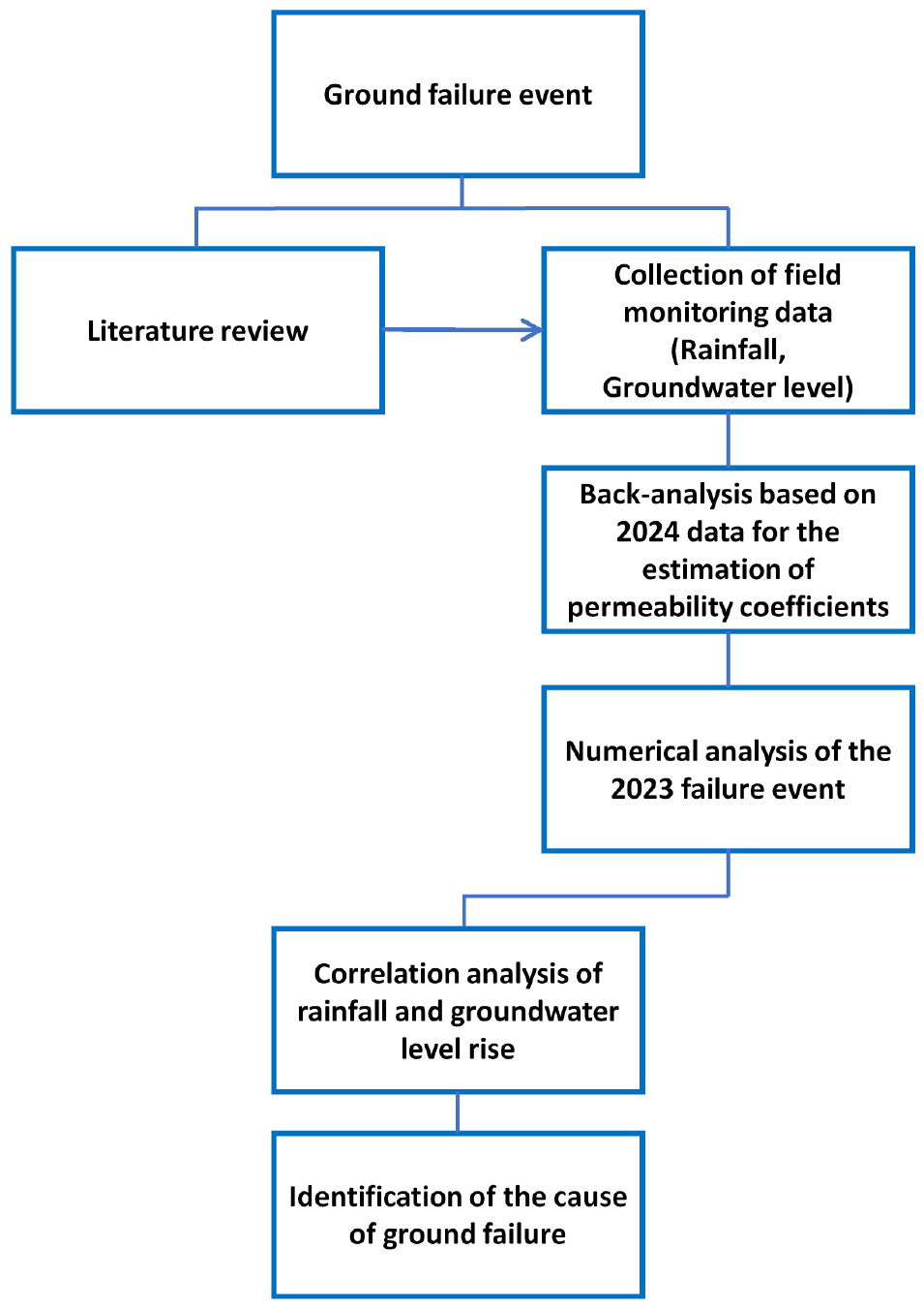 - Due to climate change, the frequency and intensity of localized heavy rainfall events have increased, leading to a rise in ground failure incidents. In such cases, groundwater level rise caused by rainfall is a major factor influencing ground stability. This study quantitatively analyzes the correlation between rainfall-induced groundwater level rise and ground stability based on an actual ground failure case. Field data collected from installed groundwater level gauges were utilized, and back analysis was conducted using data from 2024, when the ground was considered stable, in order to estimate the soil properties (permeability coefficients). Numerical analysis was performed using the commercial geotechnical software Plaxis-2D. The results of the back analysis showed an average error rate of 0.19% between the calculated and measured groundwater levels for each section, indicating that the estimated permeability coefficients were reliable and applicable to the conditions at the time of failure. Based on these properties, additional numerical analyses were conducted to assess groundwater level rise at the time of failure. The results showed that although the maximum daily rainfall during the 2024 analysis period was higher than that during the 2023 failure event, the cumulative three-day rainfall was greater in 2023. Consequently, the average groundwater level rise at the time of failure was 0.88 m, compared to 0.49 m during the peak rainfall in 2024. These findings indicate that cumulative rainfall, rather than single-day intensity, has a more significant impact on groundwater level rise, and that rapid increases in groundwater level can lead to ground instability.